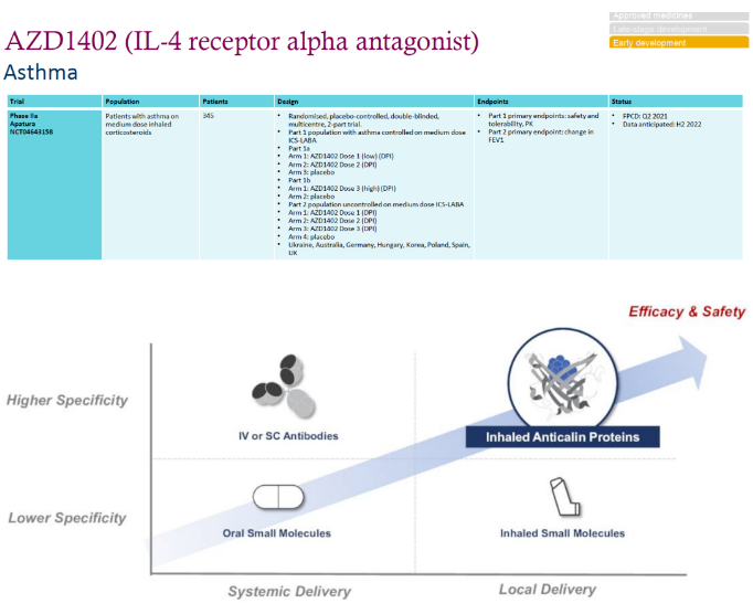 阿斯利康从Pieris引进的AZD1402为一款类抗体anticalin分子,靶向IL-4R通路,顺利获得吸入给药治疗哮喘,现在处于二期临床阶段。